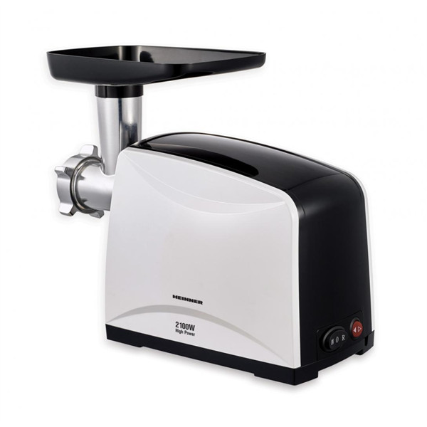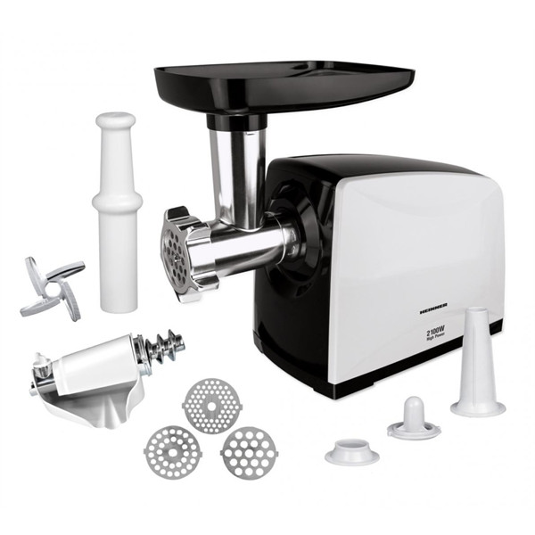 Meat grinder Heinner Weston White MG-2100BKWH, max power: 2100W, mincing capacity: 1.8kg/min, stainless steel blade, 3 cutting plates (3/5/7 mm), tomato accessory, sausages and kibbe aacessories, reverse function, noise level: 90dB