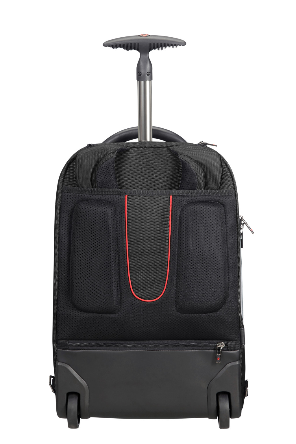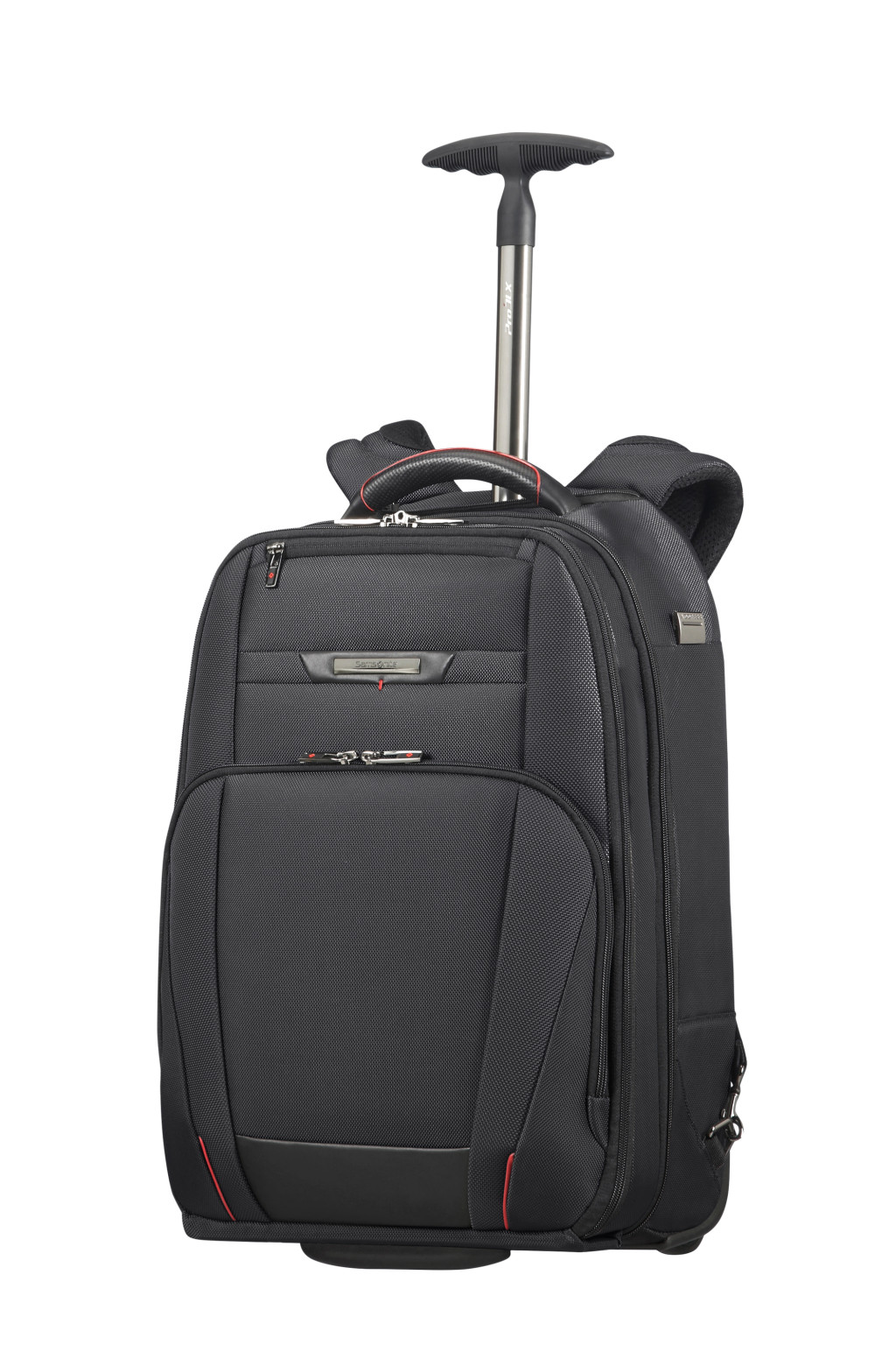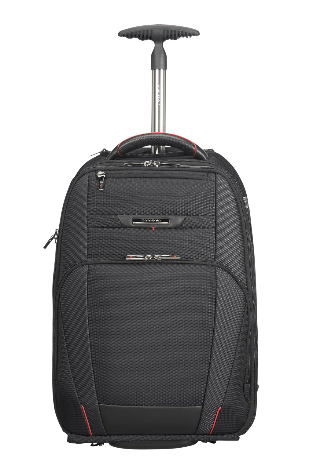 Samsonite könnyű súlyú, gurulós laptop hátizsák, kabin és kézipoggyász méret, nappa bőr díszítéssel, két elűlső cipzáros zseb, egy beépített fogantyú, egy hátsó zseb a bőröndhöz való rögzítésére, két ergonómikus állítható vállpánt, egy belső párnázott laptop rekesz memoria habbal elátva, egy párnázott tablet rekesz. Súly: 2.6 kg. Űrtartalom: 28 L.